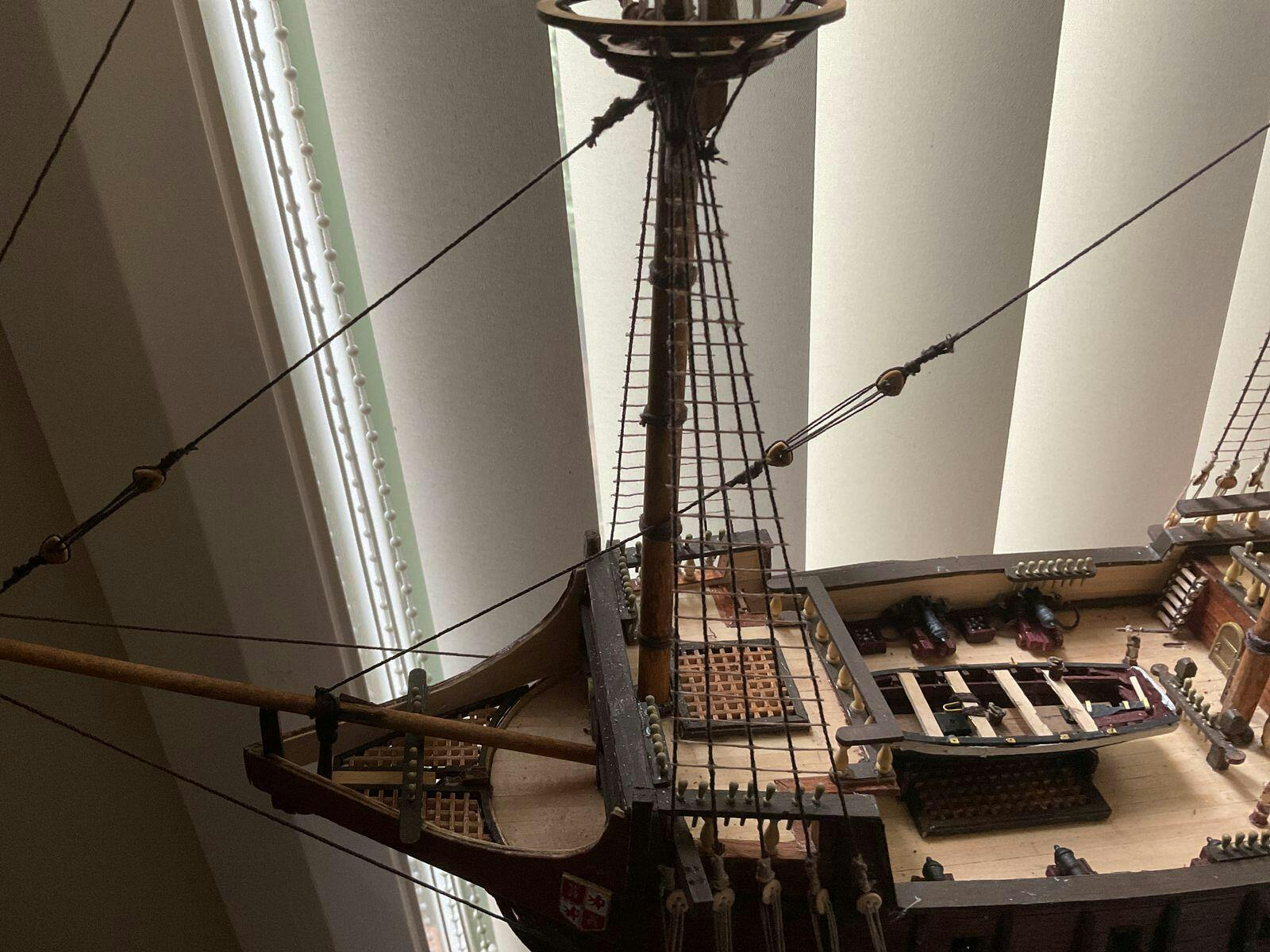 These specific ship modeling tools are placed behind the shrouds and with the side 'combs' a zig-zag thread is passed in front of the shrouds. Position everything correctly and add a dot of glue to each joint of the shrouds and the thread that you have put in front. Next, cut the excess threads, and you will see how you have created the ratlines in a much faster and easier way than making them knot by knot at each joint.