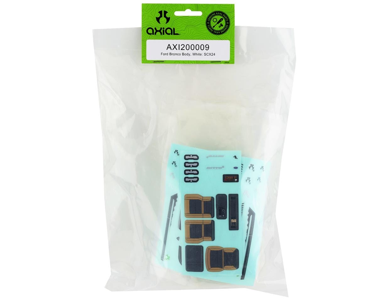 Axial SCX24 Ford Bronco Body. Package includes replacement unpainted body and accessories. Details include molded door handles, mirrors, roof rails with accessories, interior panel, LED lights and decals to allow a personalized finish.