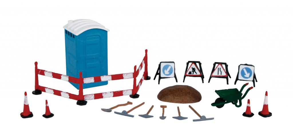 This pack of accessories contains hand-painted building site accessories including barriers, portable toilet, signs, cones and tools.