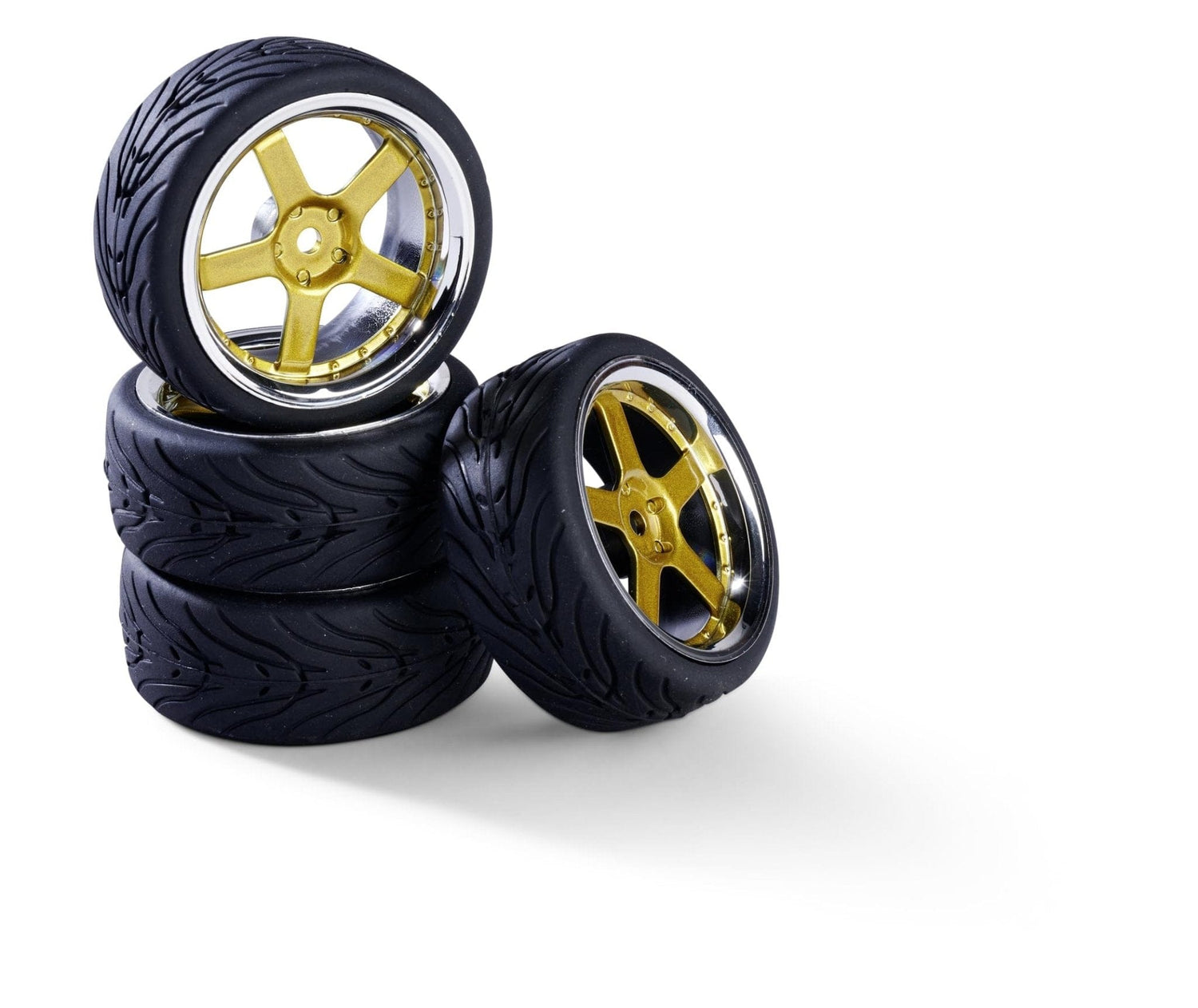 This is the Carson 1/10 Wheel Set 5 Spoke Design Chrome/Gold (4pcs)