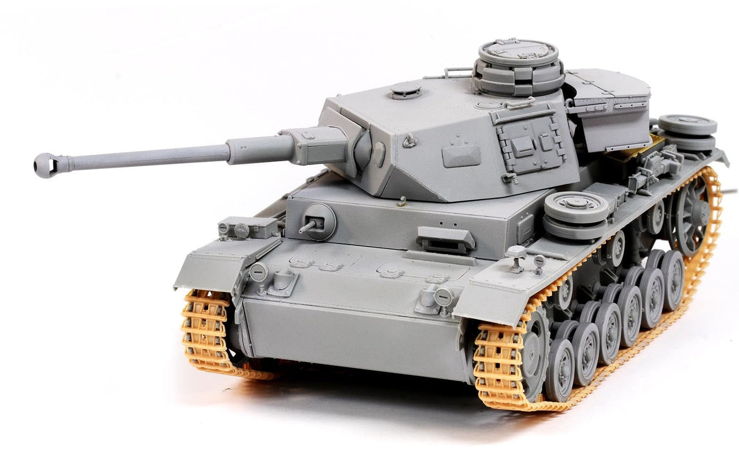 Dragon’s 1/35 scale kit of the Pz.Kpfw.III Ausf.K is a smart combination of subassemblies from previous top-quality kits. Thus, it mates a turret from a Panzer IV Ausf.F2 to a Panzer III chassis and hull. Also included in the kit is the upper hull plate from Dragon’s latest Pz.Bef.Wg.III Ausf.K command tank, which would have allowed a larger turret to be fitted on this tank. Although this ultimately remained a “paper panzer”, the Pz.Kpfw.III K is a unique-looking and well-armed tank. Modelers seeking something a little different from a run-of-the-mill Panzer III will therefore find this kit rather appealing!