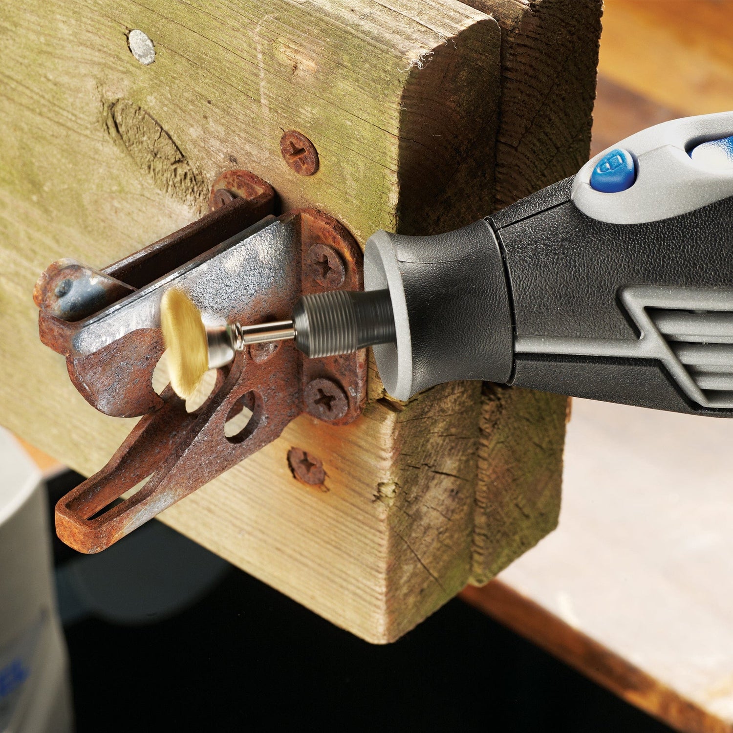 The Dremel Brass Brush 13mm (536-2) is perfect for cleaning, rust-removal and surface-finishing, especially cleaning flat surfaces and hard-to-reach places. The Brass Brushes, which are non-sparking and softer than steel which creates a soft, satin or matte finish, are ideal for use on gold, silver, bronze, copper, brass, aluminium, stainless steel, cast iron and soft metal. Keep a light touch, letting the tips of the brush do the work- too much pressure can break the bristles.