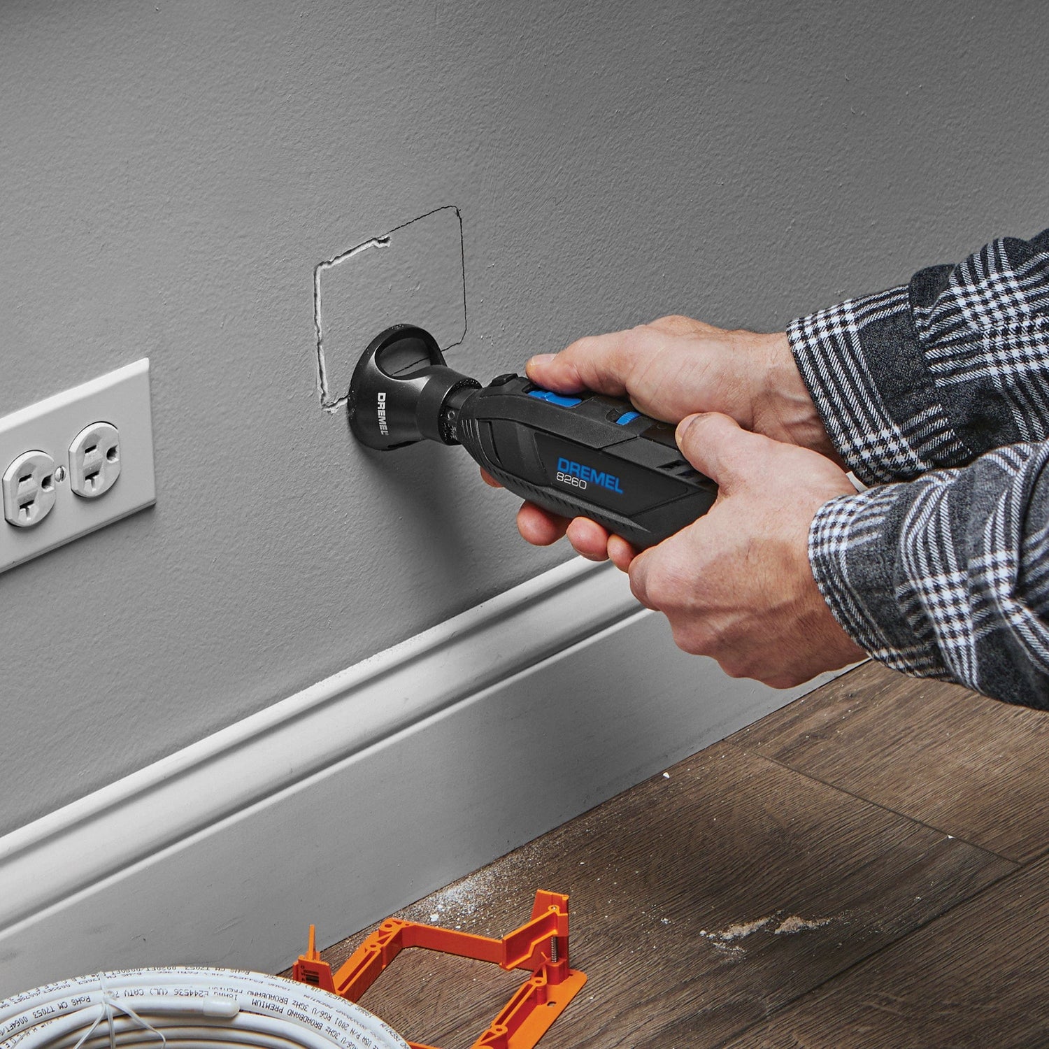 Helpful Tip: For the best cut and maximum safety always pull your Dremel rotary tool towards you and use the large windows on the cutting guide to never lose sight of your workpiece. To ensure a clean and smooth cut, use the cutting accessories at a high RPM. Use the Drywall Cutting Accessories (560) for cutting into drywall without damaging your electric wires thanks to its blunt edges.