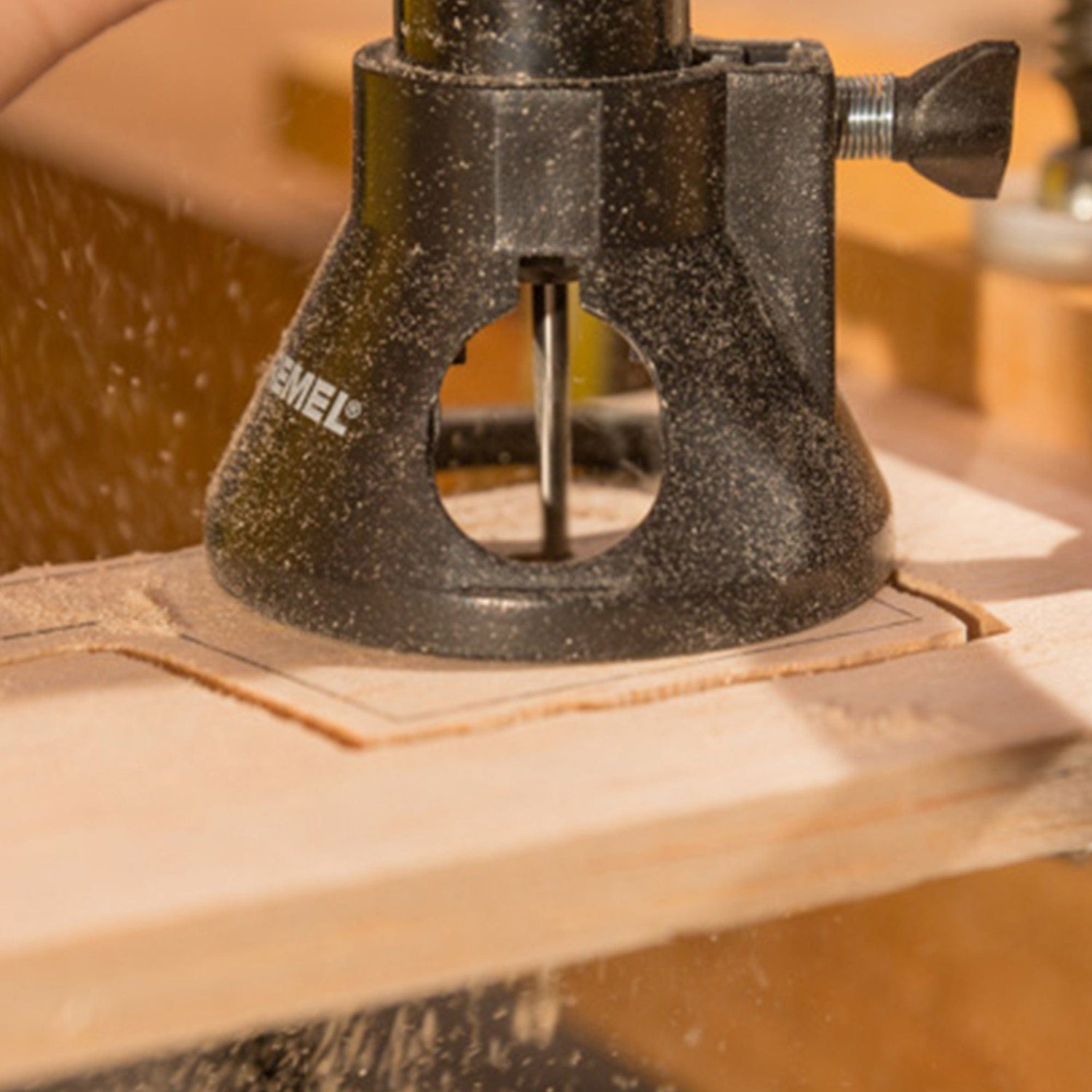 How to Use: Insert and tighten your chosen accessory before screwing on the cutting guide to your rotary tool. Adjust the depth and simply plunge into your material using 2 hands.