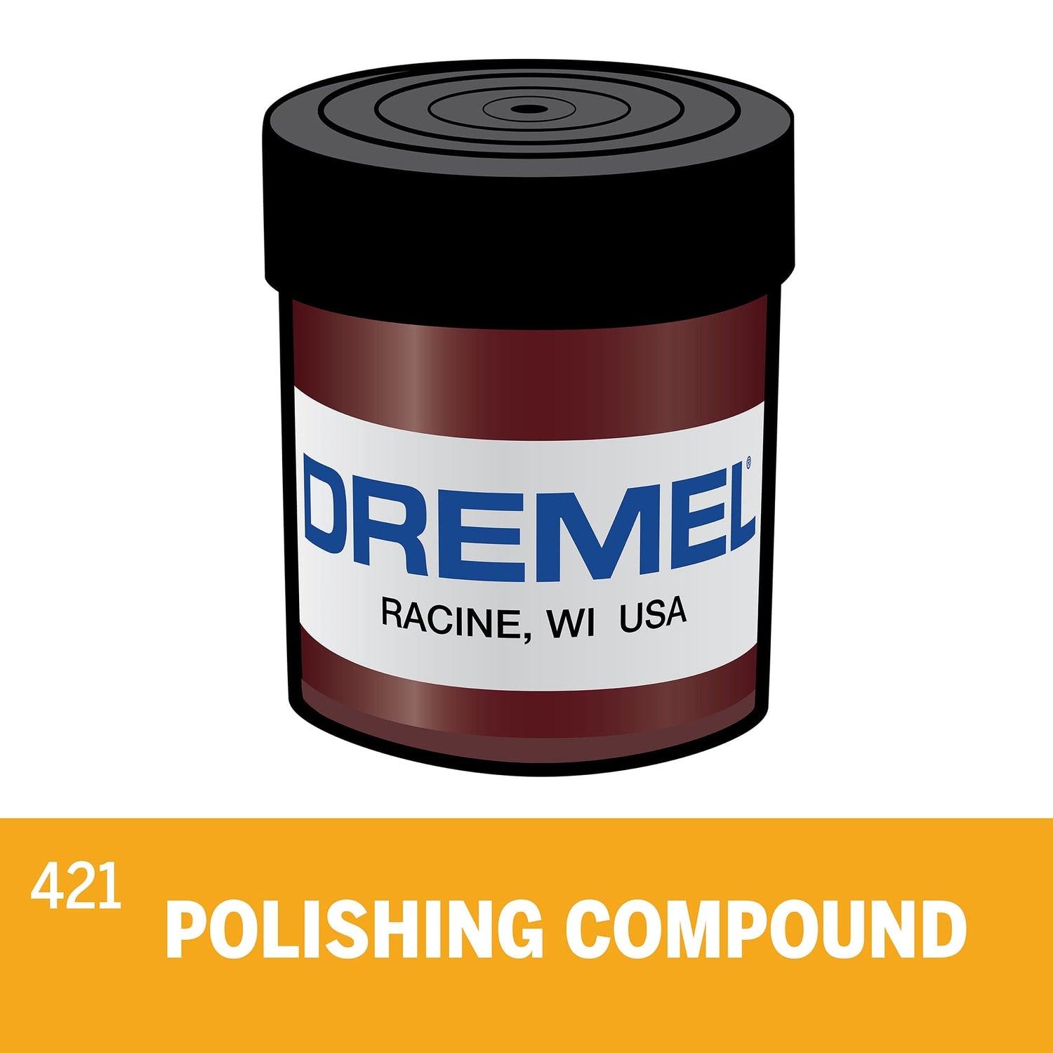 Dremel Polishing Compound is used to remove dull oxidized film and light imperfections on metals and plastics. The Dremel Polishing Compound (421) is applied with Dremel Bristle Brushes, Polishing Wheels, Polishing Felts or Carbon Steel Brushes to polish, brighten or light surface imperfections. When working with the Dremel Polishing Compound (421), keep the tool speed as low as possible.