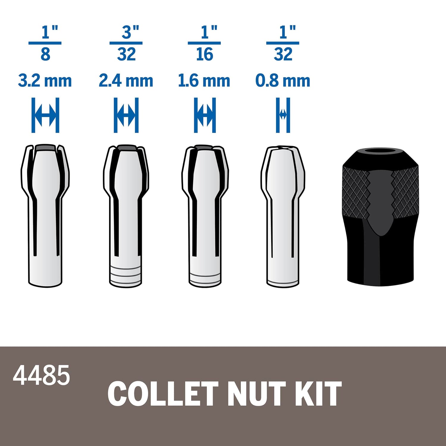 The Dremel Quick Change Collet Nut Kit (4485) provides the optimal grip for a wide range of accessories offered for our Dremel rotary tools. The rings correspond with the size of the collet, and the collet features small identification rings around its shank. The Dremel Quick Change Collet Nut Kit (4485) with all Dremel rotary tools and the Dremel Flex Shaft Attachment (225).