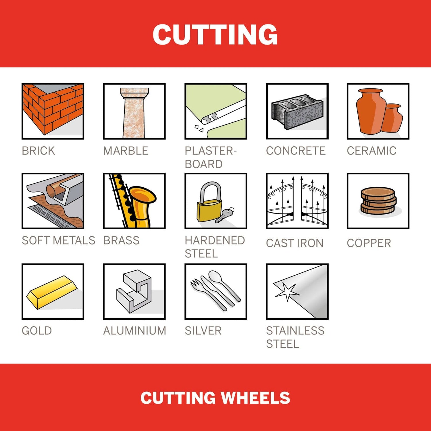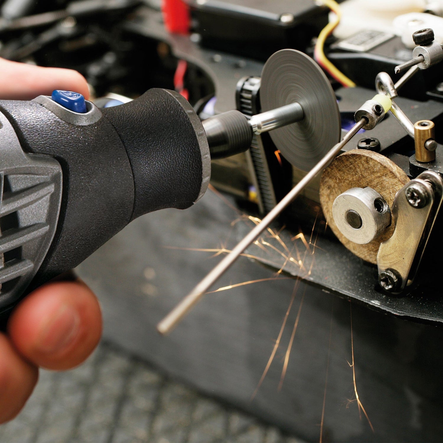 The Dremel Reinforced Cut Off Wheels 32mm (426) are reinforced with fiberglass for increased durability that's used for slicing, cutting and slotting bolts, screws, sheet metal, thin wood, plastic and ceramic. The Dremel Reinforced Cut Off Wheels 32mm (426) make it easy to cut bolts or screws, or make slots in rusted or stripped bolts and screws to allow for easy removal with a screwdriver. The Dremel Cut Off Wheels only cut along its edge and are for limited use on wood and plastic. Do not attempt to sand or cut curved holes with them.