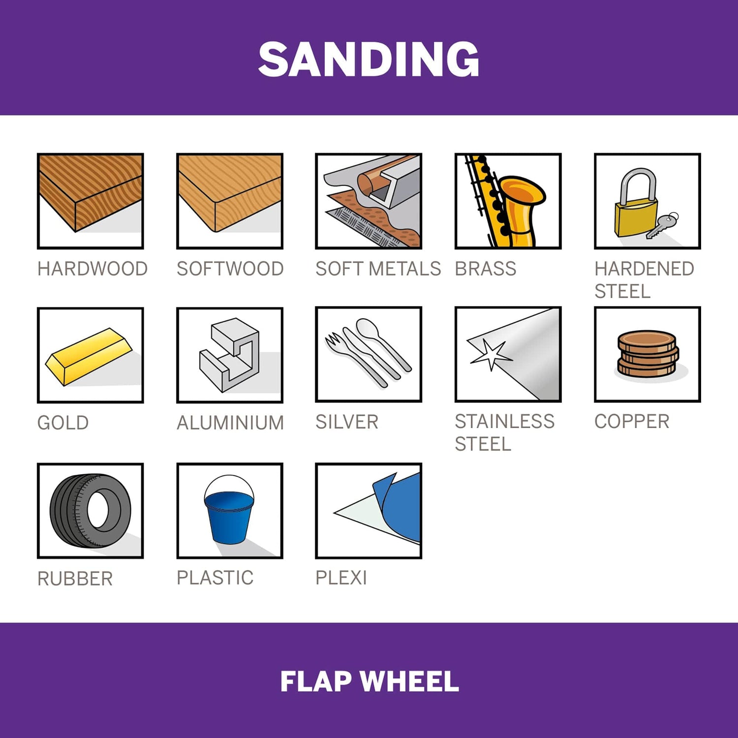 The Dremel Sanding Flap Wheel 80 Grit (502) works well for gentle paint or rust removal, light material clean up, and polishing flat or contoured surfaces. The Dremel Flap Wheels are effective as a finishing sander after heavier surface sanding and material removal is completed. The Dremel Sanding Flap Wheel 80 Grit (502) features a medium 80 grit, perfect for sanding bare wood to prepare it for removing varnish and final finishing.