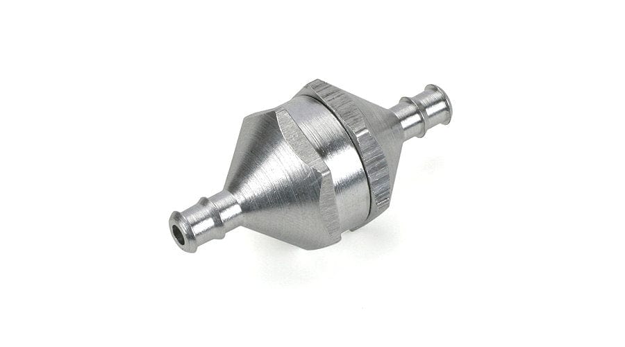 Constructed of two threaded aluminum parts which separate for ease in cleaning. Works for both gas and glo fuels. 130 micron mesh screen filter to filter out the smallest of particles and an o-ring for a positive, no-leak seal. Dimensions: 1.125" (28.575 mm) L X 7/16" (11.11 mm) W.