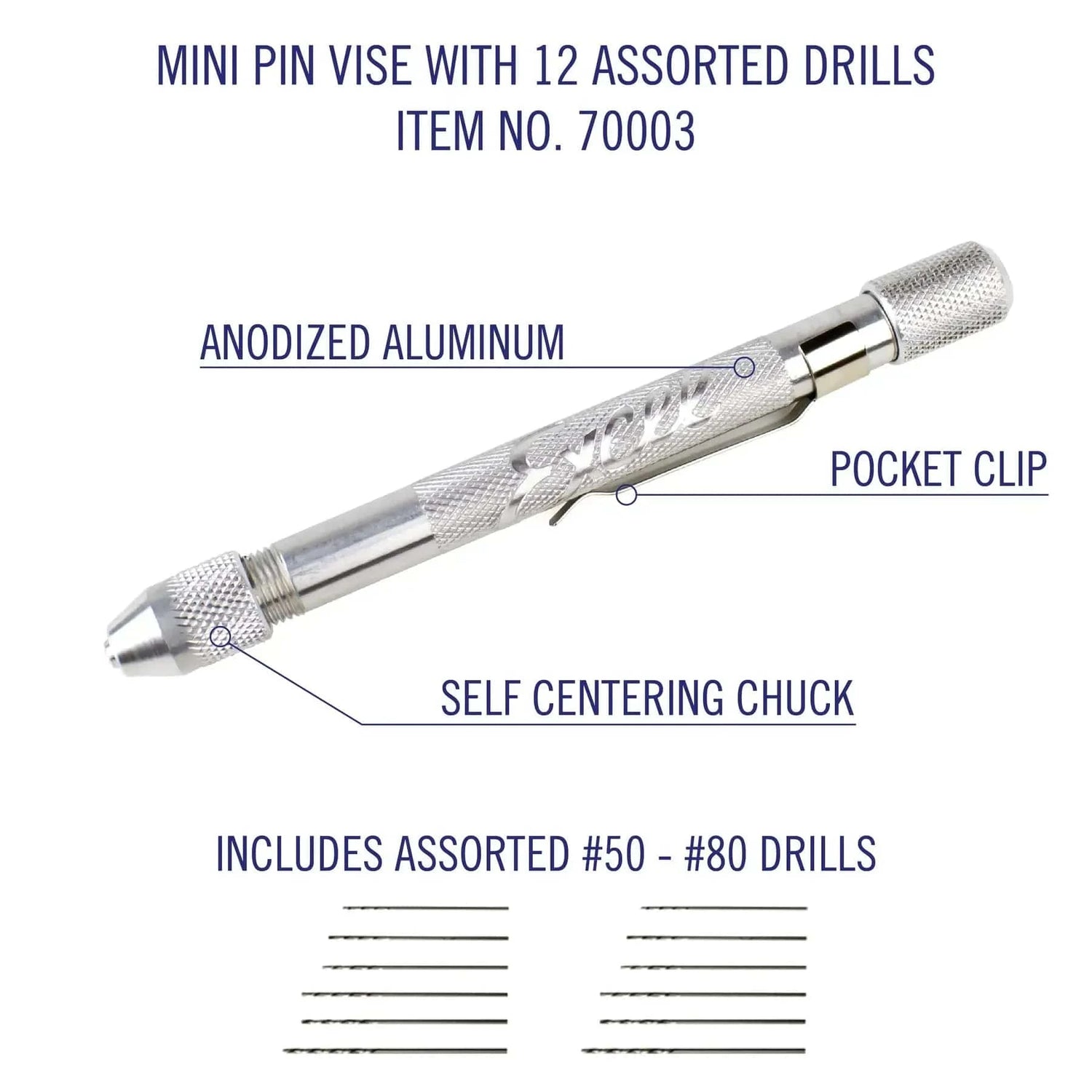 - This pin vise has a permanent self-centering aluminum chuck that accommodates drills #50 (.0700) through #80 (.0135).