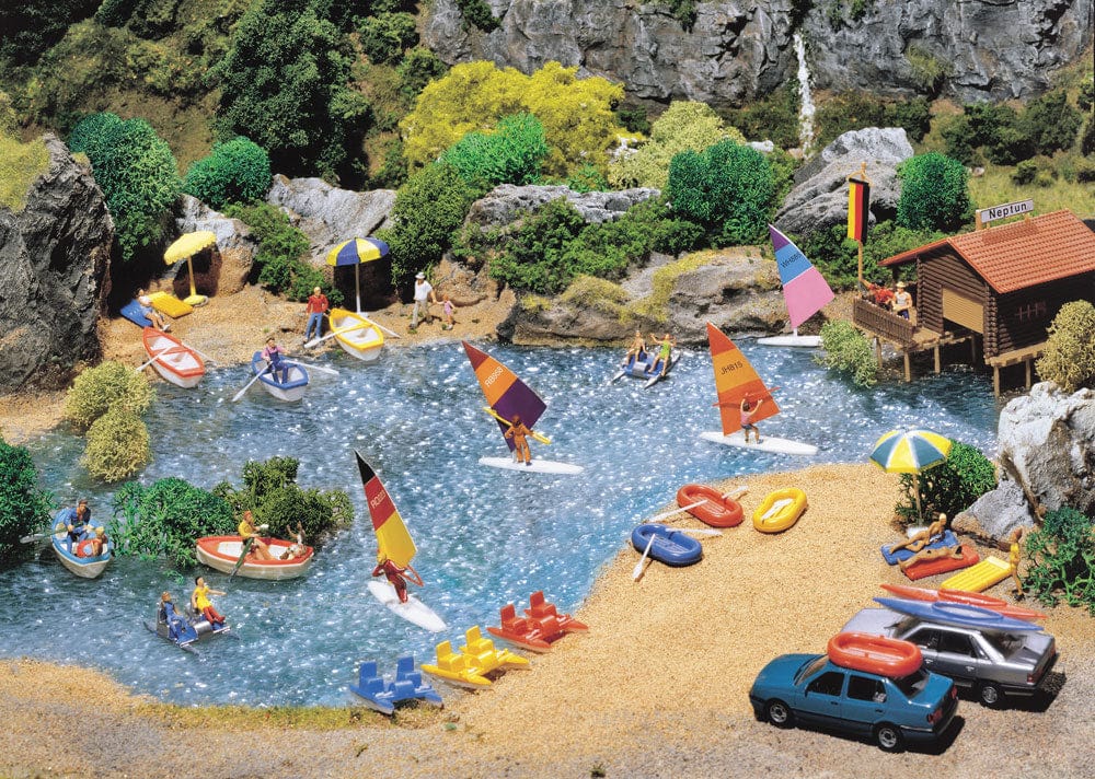 Bring back happy memories of sunny summer days spent on the lake. Set includes 3 pedal boats, rowboats, kayaks, rubber dinghies, windsurfing boards with sails and six air mattresses for relaxing on the beach or floating in the water.