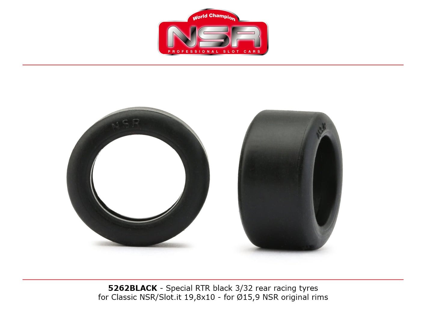 The NSR Special Slick Classic NSR/Slot.it BLACK Rear Racing 19.8x10 Tires are specifically designed for Ø 15.9 NSR original rims, making them a perfect fit for your classic NSR or Slot.it cars. With a sleek black design, these tires not only perform well but also add a touch of style to your racing setup.