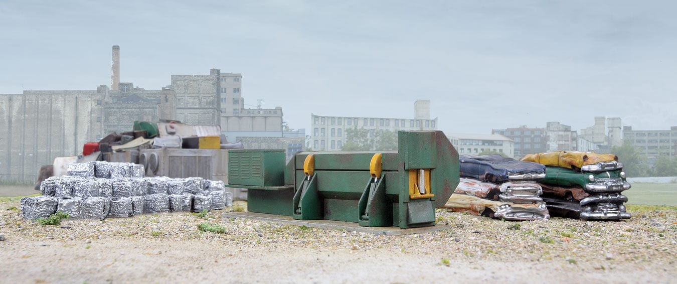 While offered as an accessory for use with the Walthers Cornerstone Washington Salvage Scrap Yard kits, this Baler-Logger is an ideal addition to any industry that processes scrap metals. Scrap yards, the steel industry and economic markets are closely linked. The demand, and the price paid for scrap governs how long a yard will store or how quickly it sells its scrap. If demand or prices are low for any product, volumes for that product build up and the piles get high. When demand and prices rise, stored volumes are sold off quickly to generate a profit. Washington Salvage Scrap Yard is actually two businesses - an auto salvage business and a scrap business. Washington Salvage Scrap Yard includes easy-to-build plastic kits like the Baler-Logger. As well as cast-resin ready-to-use scenery details like junk auto piles. Check out all of the Washington Salvage Scrap Yard