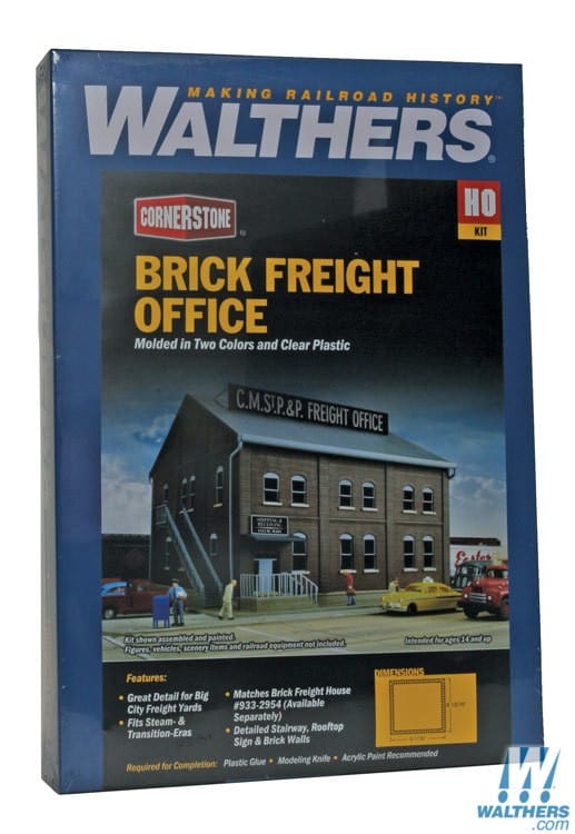 The Walthers Cornerstone Brick Freight Office is where businesses and small industries that didn't have their own sidings arranged for rail service. Many off-line shippers relied on the railroad to move their goods from trains to trucks for delivery to stores and warehouses. The freight office served as the "brains" of the operation, housing an army of clerks who kept track of paperwork and billing. This kit is based on structure that stood on Fowler Street, just south of Milwaukee's hometown depot. It's companion Freight House next door handled cargo transfers between boxcars and delivery trucks. Their classic American design is similar to buildings in many other cities making both models ideal for use in any city terminal. On your layout they can also be used as part of a larger industry or in a railroad yard to handle company materials. Authentic Milwaukee Road signs are included in the Freight Office kit, but you can easily add your own signs for other railroads or shippers. The easy-to-build Brick Freight Office has detailed plastic parts molded in appropriate colors and comes with illustrated instructions. The finished structure as shown measures: 8-13/16 x 9 x 6-1/8" 22.4 x 22.9 15.6cm.
