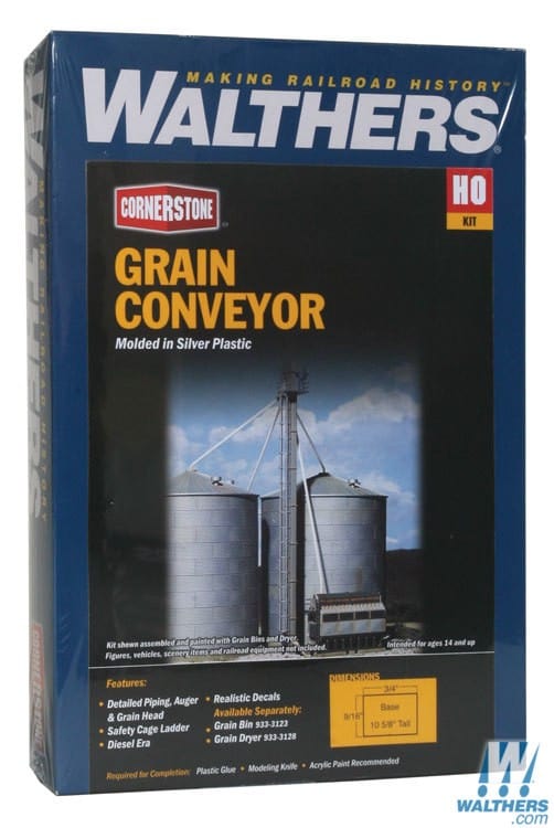 The Walthers Cornerstone HO Scale Grain Conveyor is an ideal addition to any diesel-era grain elevator or feed mill scene. Conveyor "legs," or elevators, lift wet and dry grain using an endless bucket conveyor. At the top, the funnel-shaped distribution head routes grain into the proper pipe, sending it cascading into storage bins, surge bin, covered hopper or grain truck. A typical grain operation has two or more legs, with at least one each dedicated to incoming wet or outbound dry grain. Use the Grain Conveyor with other Cornerstone grain-related structures and cars. NOTE: Photo shows model with the Walthers Cornerstone Grain Dryer 933-3128 and Grain Bin 933-3123, both sold separately.