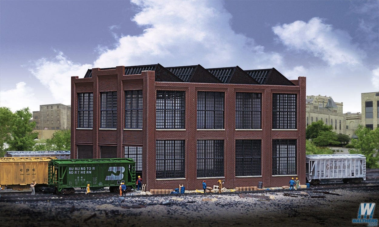 The prototypes for railroad buildings like the Walthers Cornerstone Car Shop evolved into long, specialized structures dedicated to freight or passenger car repairs. Several tracks ran the entire length of the building so cars could be moved quickly between workstations handling trucks, brakes, interiors and other appliances. Perfect for servicing any kind of equipment, this kit features a modular design so several can be combined to build a larger building, and it's a natural for modeling all kinds of heavy industries.