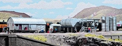 The prototypes for bulk oil distributors like the Walthers Cornerstone N Scale Interstate Fuel and Oil have long been important for every railroad. At home in cities and towns, dealerships like this distribute fuel oil, gasoline and other products locally. This structure kit includes horizontal and vertical storage tanks, above-ground piping, pump house with header stand to unload tank cars, truck loading rack and corrugated metal office. A gas pump, oil drums and other details are also provided. Like the prototypes, the various pieces on Interstate Fuel and Oil can be arranged to fit available space and the kit structures are also easily split up for other uses on your layout. Interstate Fuel and Oil is a great addition to scenes among other Cornerstone N Scale industrial buildings.