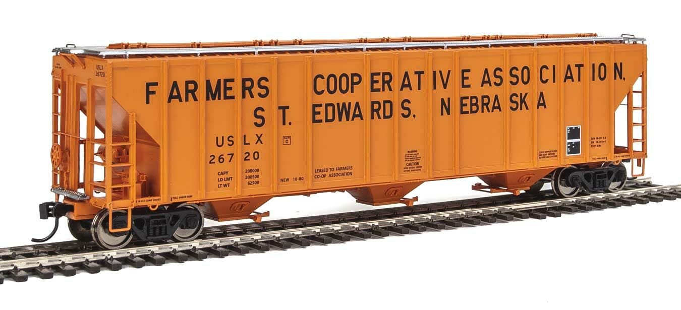 Walthers Proto HO 55ft Evans 4780 Covered Hopper - Ready To Run - Farmers Co-op Association USLX #26720 (St. Edwards, Nebraska; orange, black)