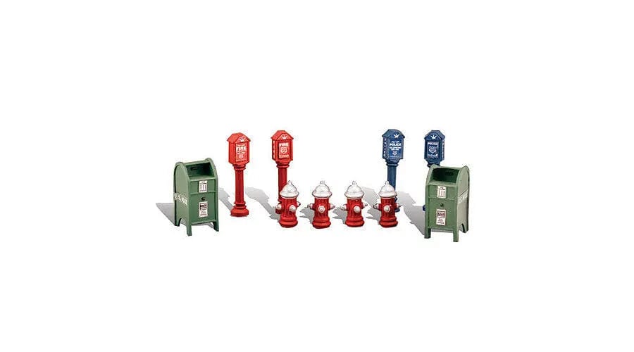 Accessorize a street scene with items that includes fire hydrants, street mailboxes and emergency fire and police call boxes.